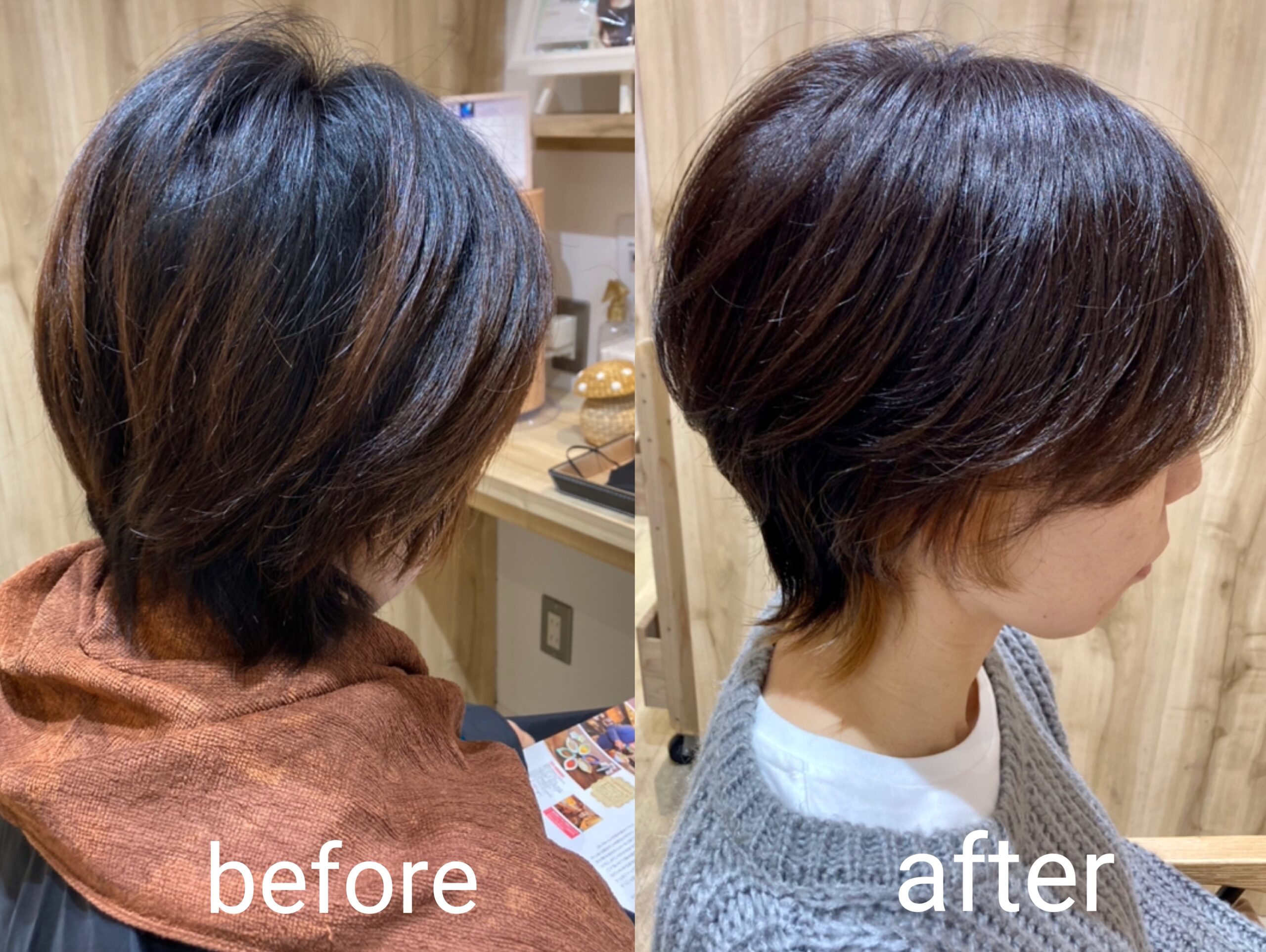 えりあし長めのショートマッシュウルフ×インナーカラーのお客様の持ち込みデザインにしていきます。