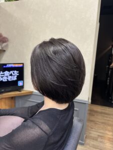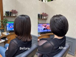 前上がりのひし形レイヤーボブで動きとまとまり良く仕上げました。ヘアエステもおこなっているのでよりツヤツヤしっとり柔らかく扱いやすい髪の毛になっています!カラーもラベンダーアッシュで大人な柔らかアッシュでとても素敵です!