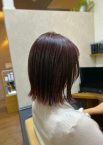 ブリーチ部分には、赤みが鮮やかに入り、光に当たると透けるような透明感とツヤが生まれます。