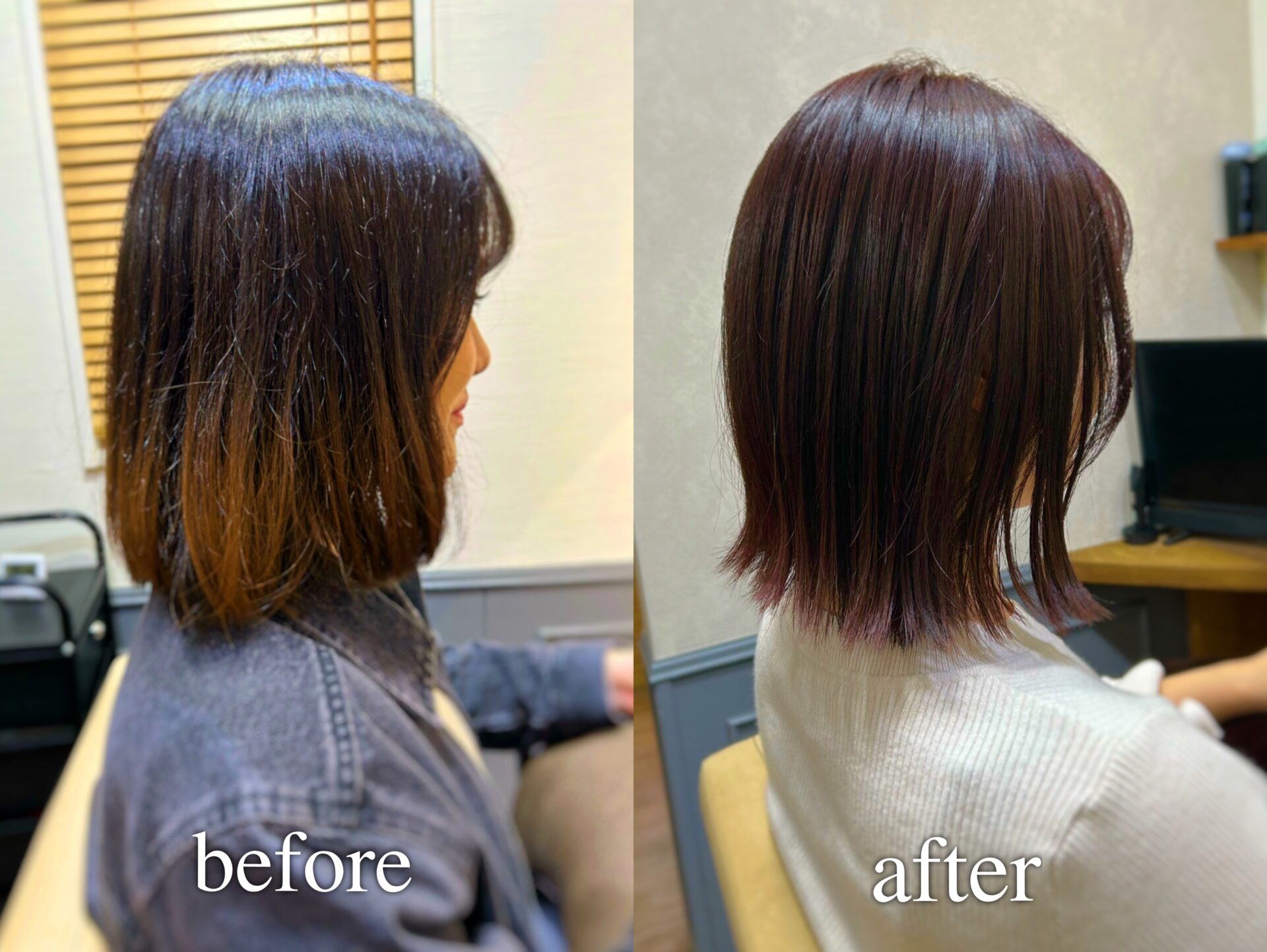 以前のブリーチ部分を活かしつつ、リタッチ部分との差を馴染ませるため、深みのある暗めのレッドブラウンをご提案しました。