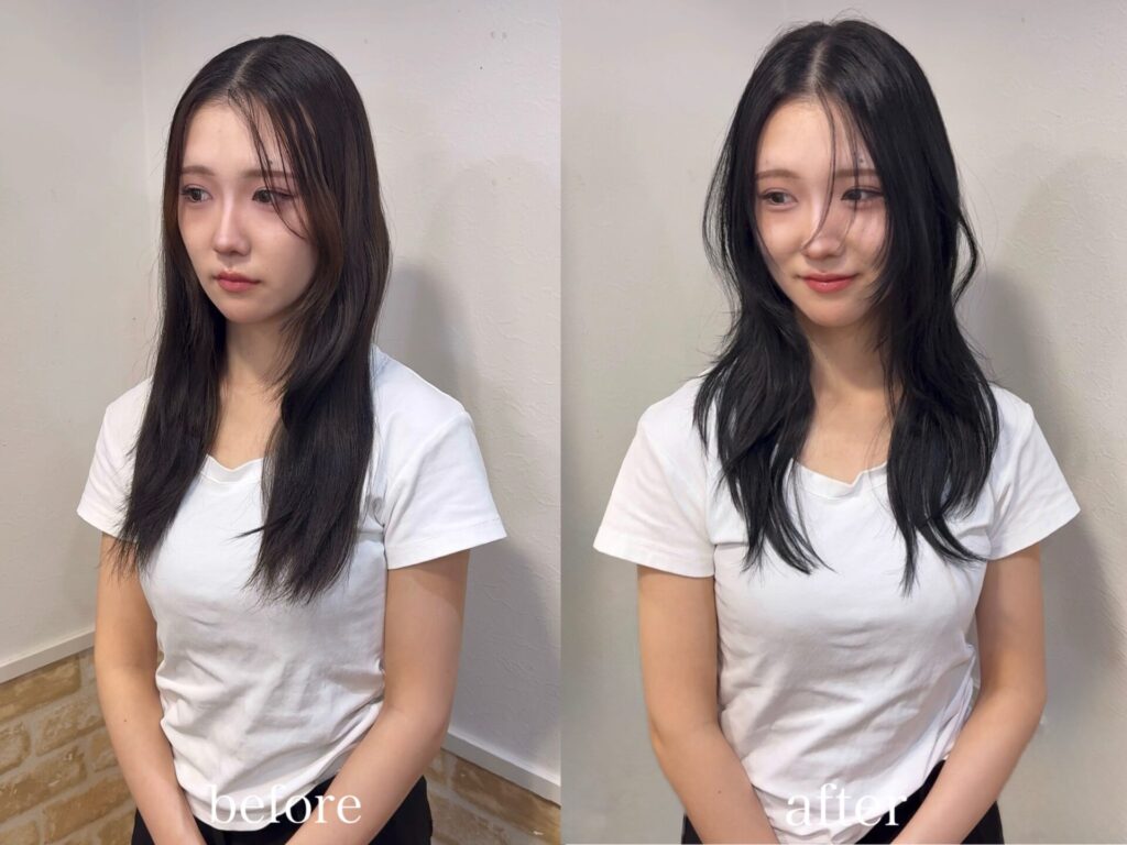 暗髪でも柔らかく見えるような似合わせレイヤーもぜひお任せください!