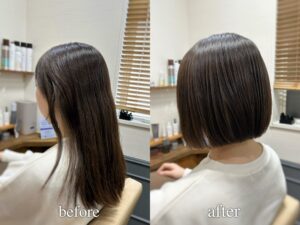 毎朝のスタイリング時間を短縮し、お客様の理想を形にします。今回は縮毛矯正とカットを組み合わせてスタイルを創らせていただきました。