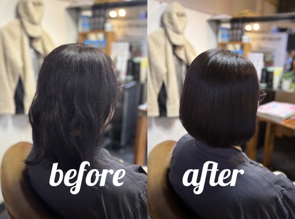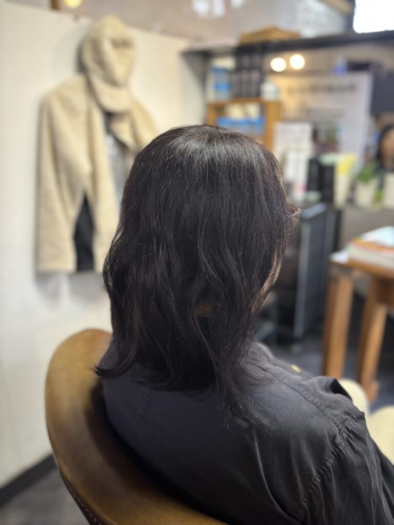 ダメージが蓄積している部分は切って、以前かけていた矯正の部分もかけ直させていただきました。艶とまとまりが出てとても綺麗になりましたね。