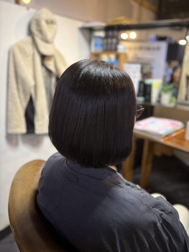縮毛矯正はピンピンな針金のようになるイメージをお持ちの方もいると思いますが、薬剤選定、処理剤、アイロンワーク等で柔らかく自然な質感で、なおかつ艶髪になるよう心掛けて施術しております。