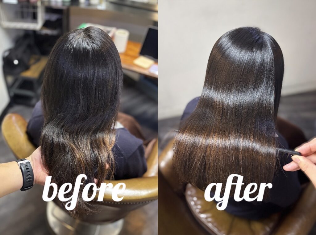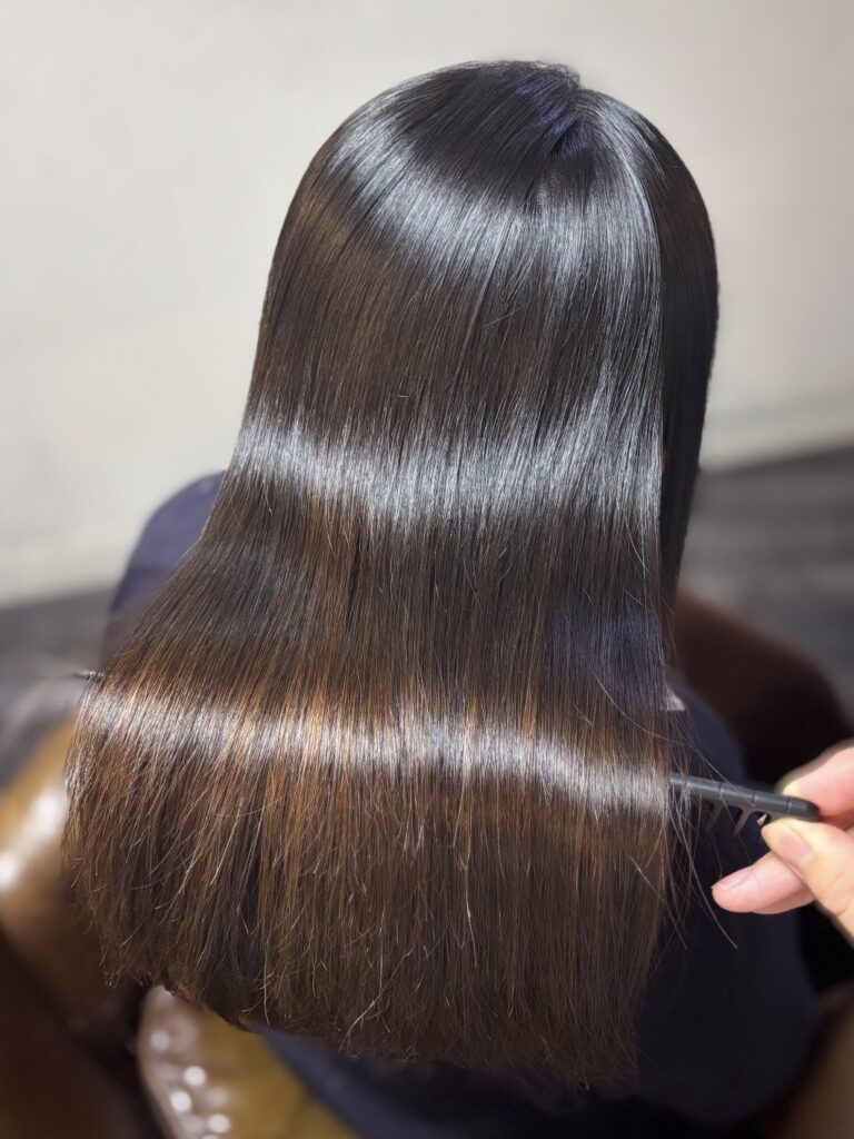 縮毛矯正はピンピンな針金のようになるイメージをお持ちの方もいると思いますが、薬剤選定、処理剤、アイロンワーク等で柔らかく自然な質感で、なおかつ艶髪になるよう心掛けて施術しております。