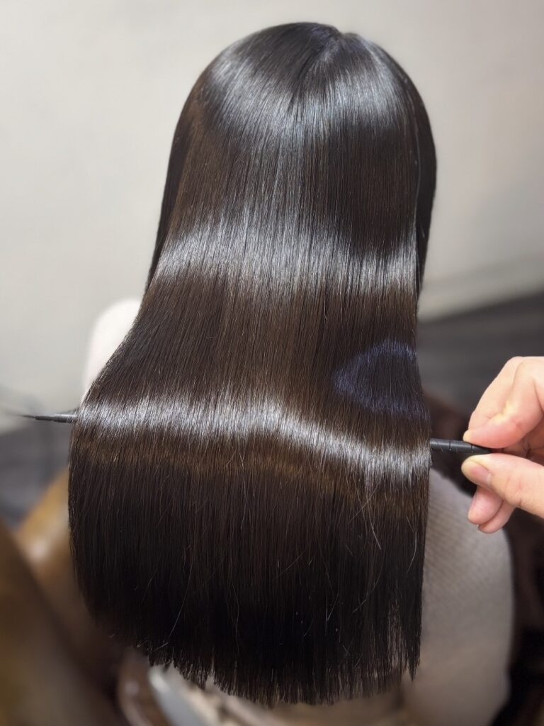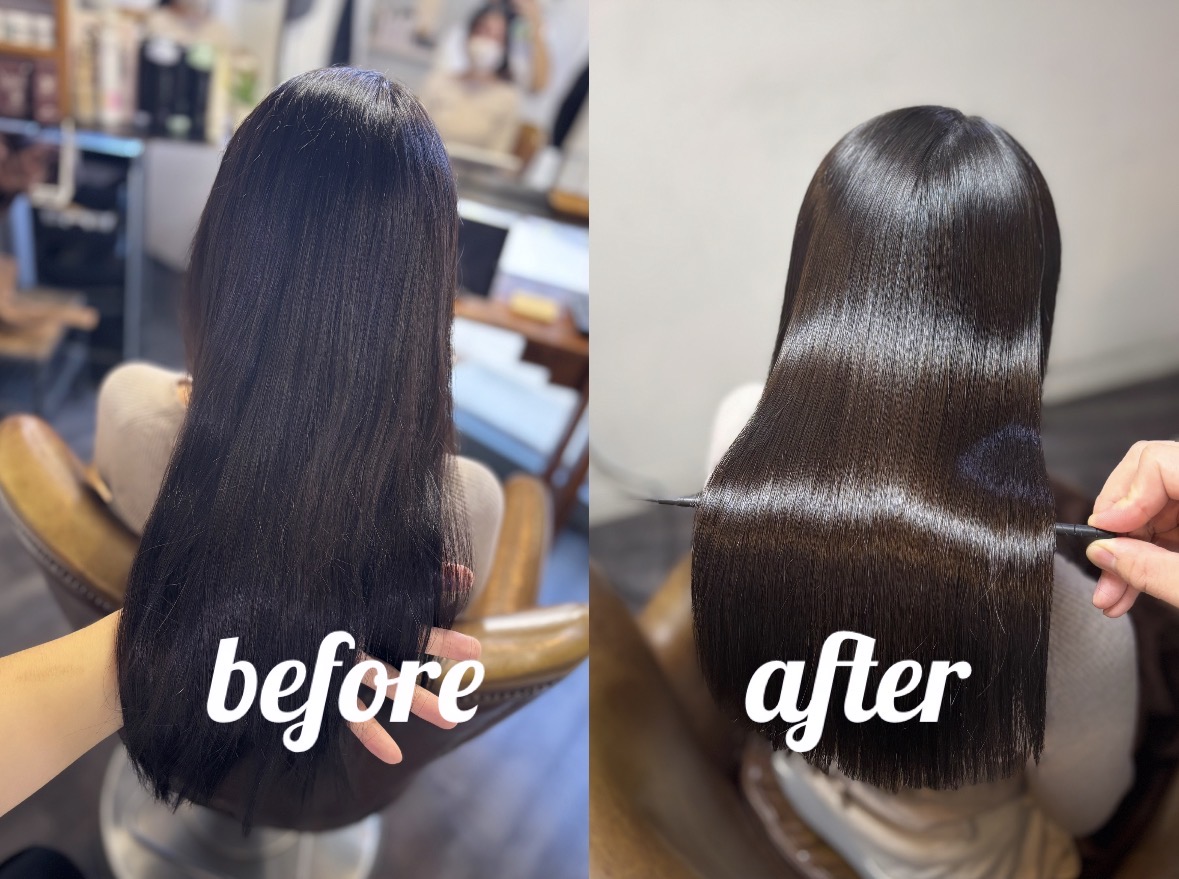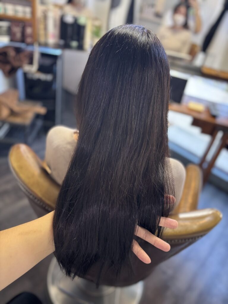 縮毛矯正はピンピンな針金のようになるイメージをお持ちの方もいると思いますが、薬剤選定、処理剤、アイロンワーク等で柔らかく自然な質感で、なおかつ艶髪になるよう心掛けて施術しております。
