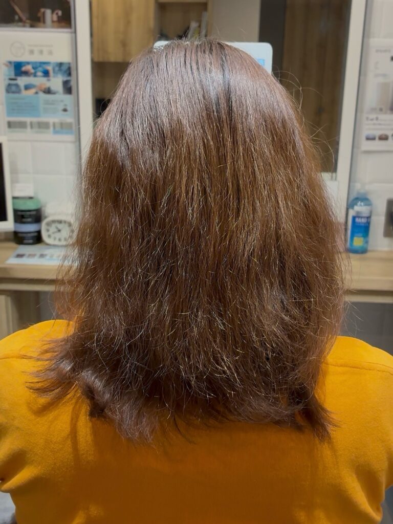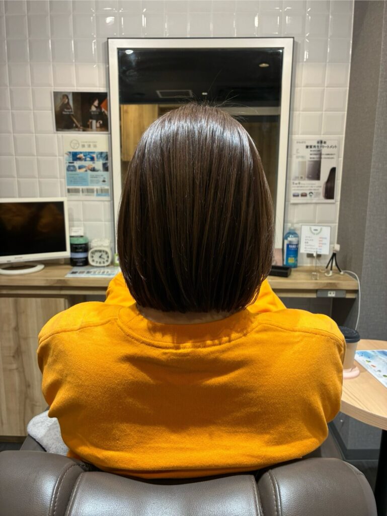 癖をパーマ風にセットできるお客様でしたが、髪質再生トリートメントは最後に低温でアイロンを通して定着させるので、今回はストレートに仕上げています。