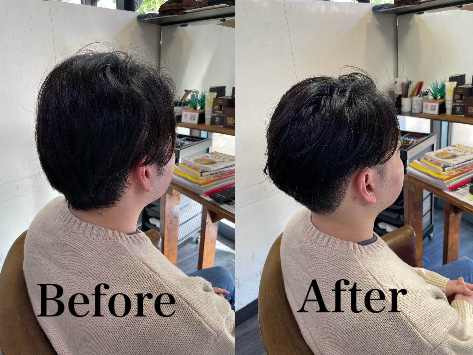 柔らかいクセ毛をいかして6:4分け目のテーパーフェードスタイルに