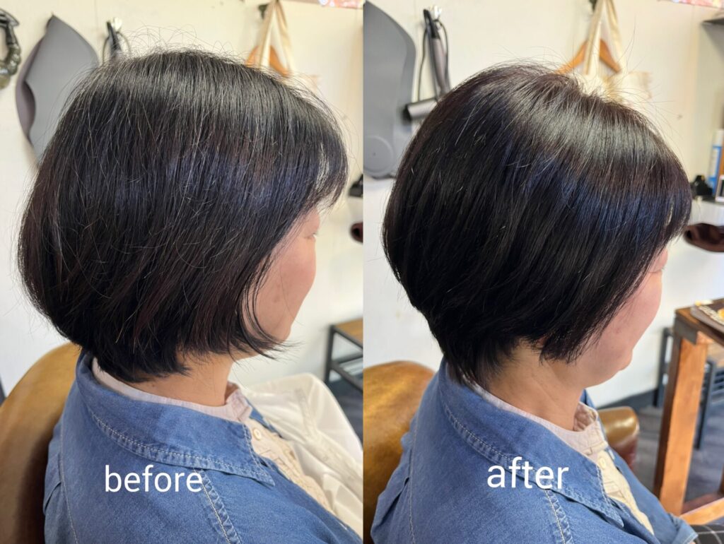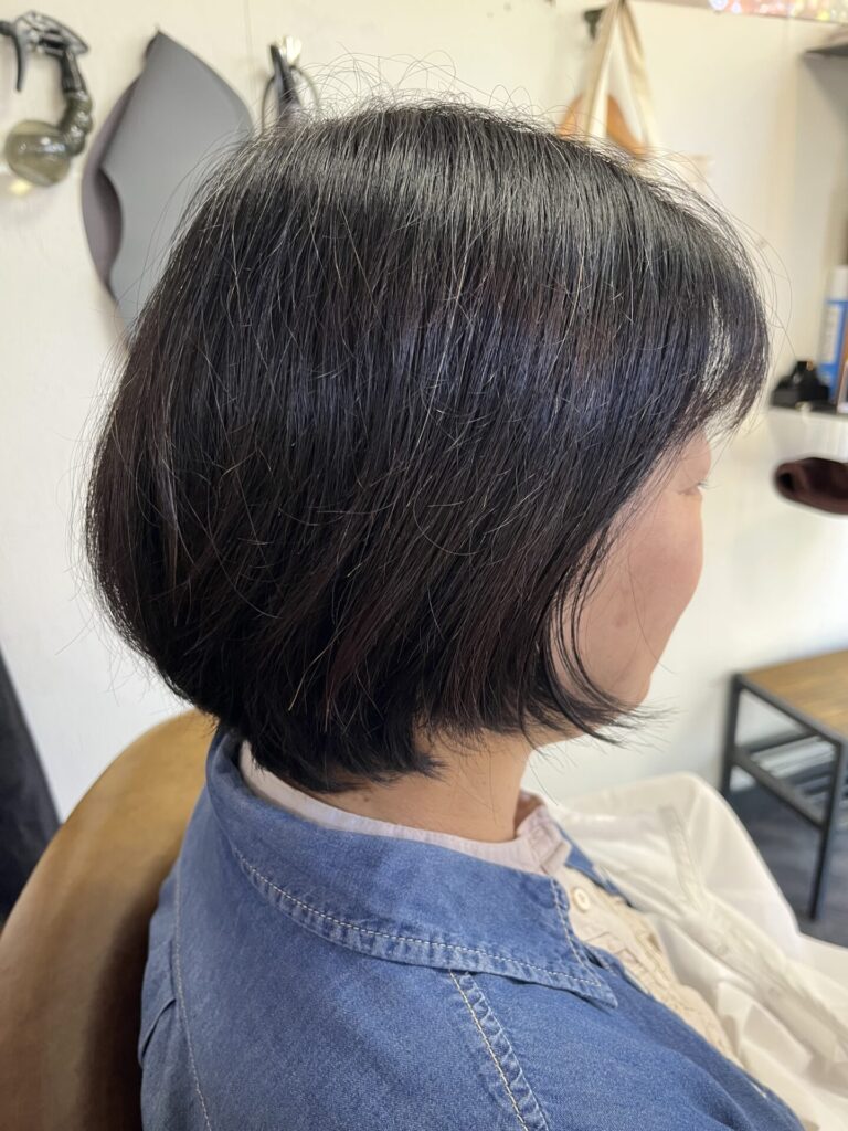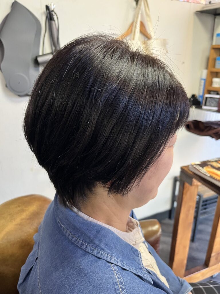 襟足はクセをみながらぎりぎり短めにし、ストールを巻いても邪魔にならない長さに、カラーもダークブラウンで艶感アップにしました。