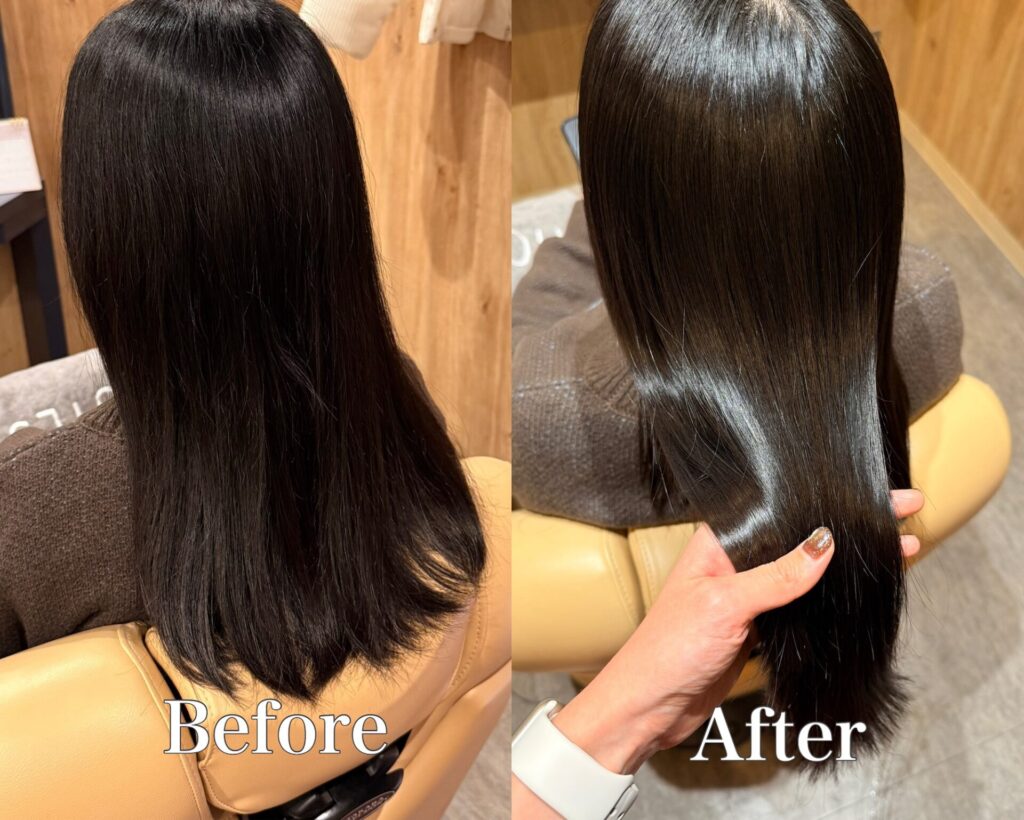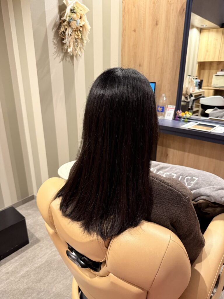 全体的にはクセはあまり気にならないのですが、切れ毛にクセが出てしまってパヤパヤの原因になっているので縮毛矯正で切れ毛も真っ直ぐにすることでパヤつきが収まり艶がでました!