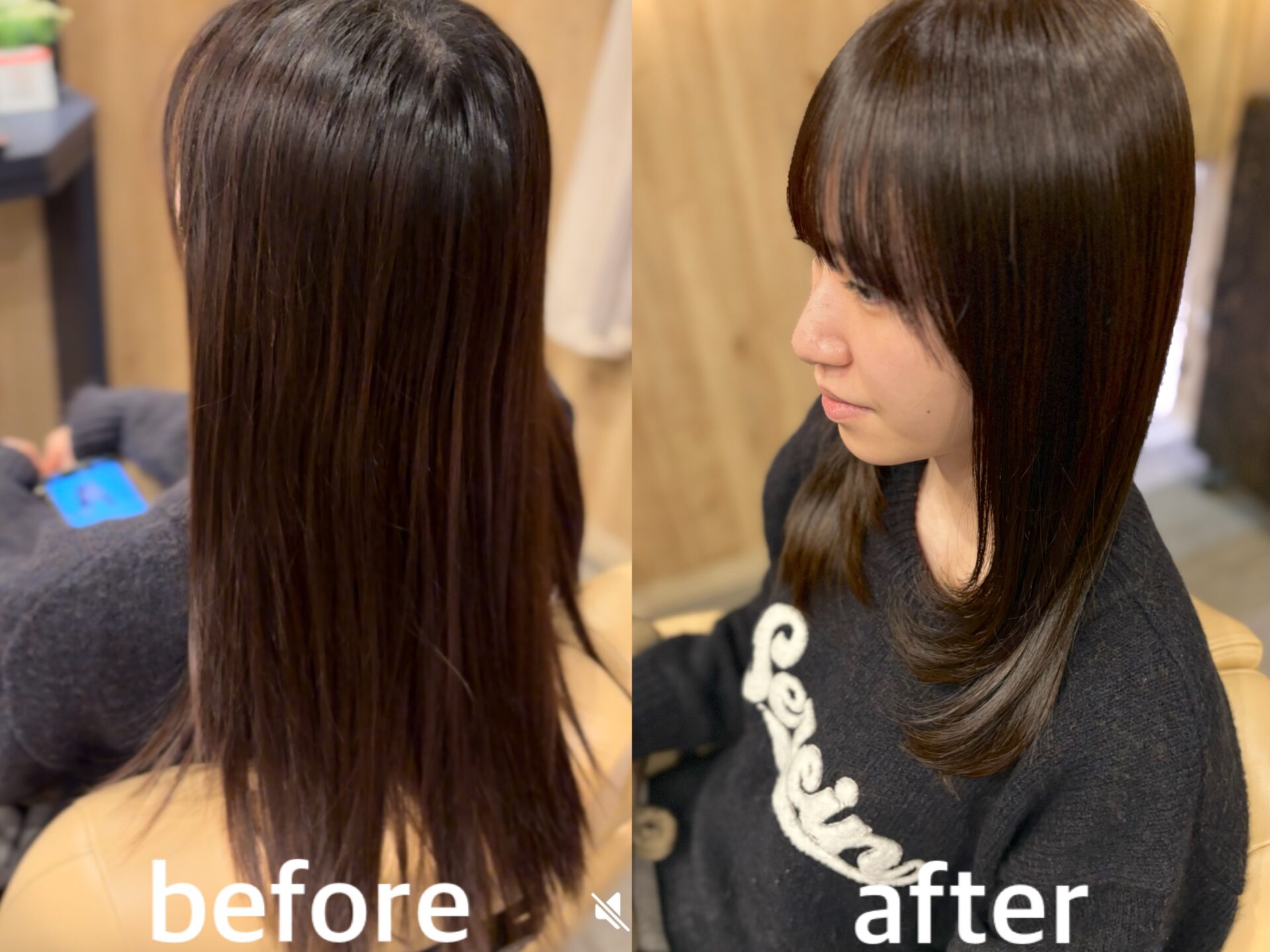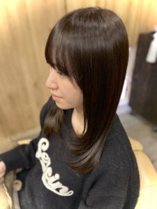 カラーは淡いピンクページュでツヤツヤの仕上がりに。顔まわりと毛先にレイヤーを入れて、軽やかな仕上がりになりました。