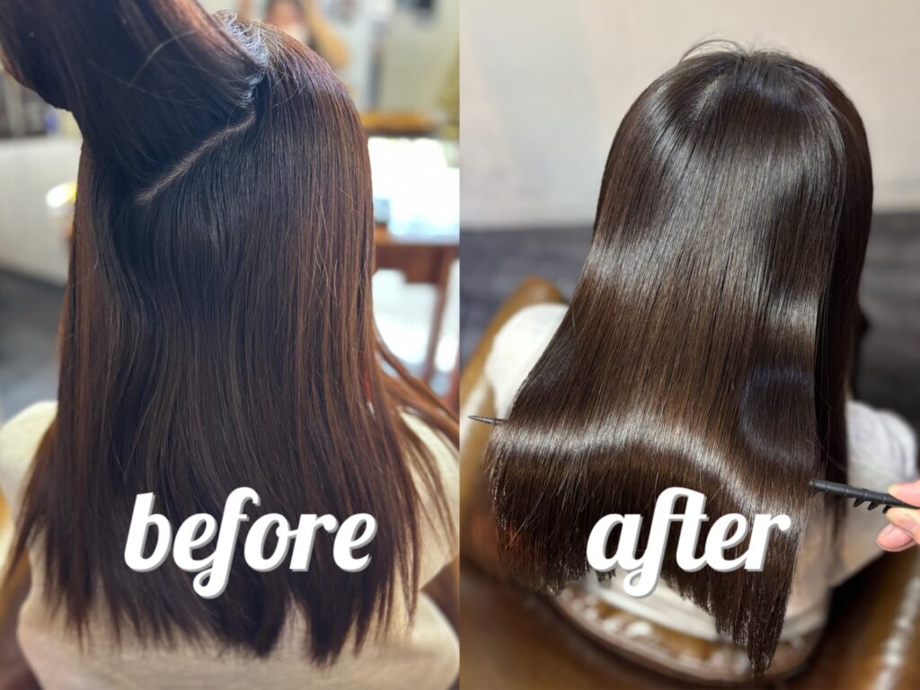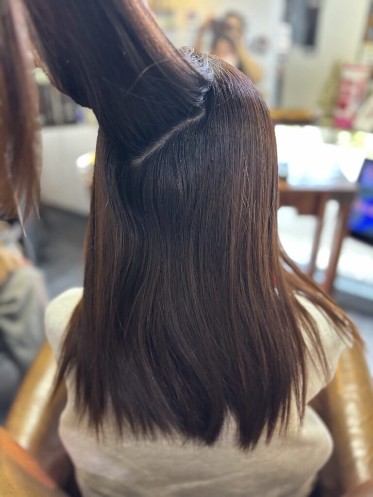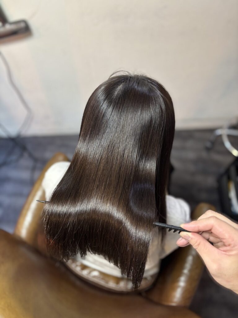 縮毛矯正はピンピンな針金のようになるイメージをお持ちの方もいると思いますが、薬剤選定、処理剤、アイロンワーク等で柔らかく自然な質感で、なおかつ艶髪になるよう心掛けて施術しております。