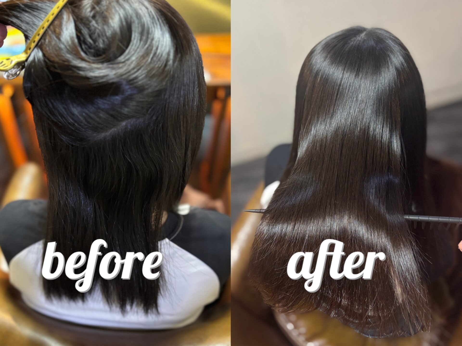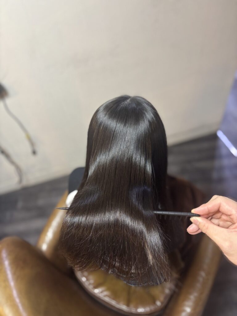 縮毛矯正はピンピンな針金のようになるイメージをお持ちの方もいると思いますが、薬剤選定、処理剤、アイロンワーク等で柔らかく自然な質感で、なおかつ艶髪になるよう心掛けて施術しております。