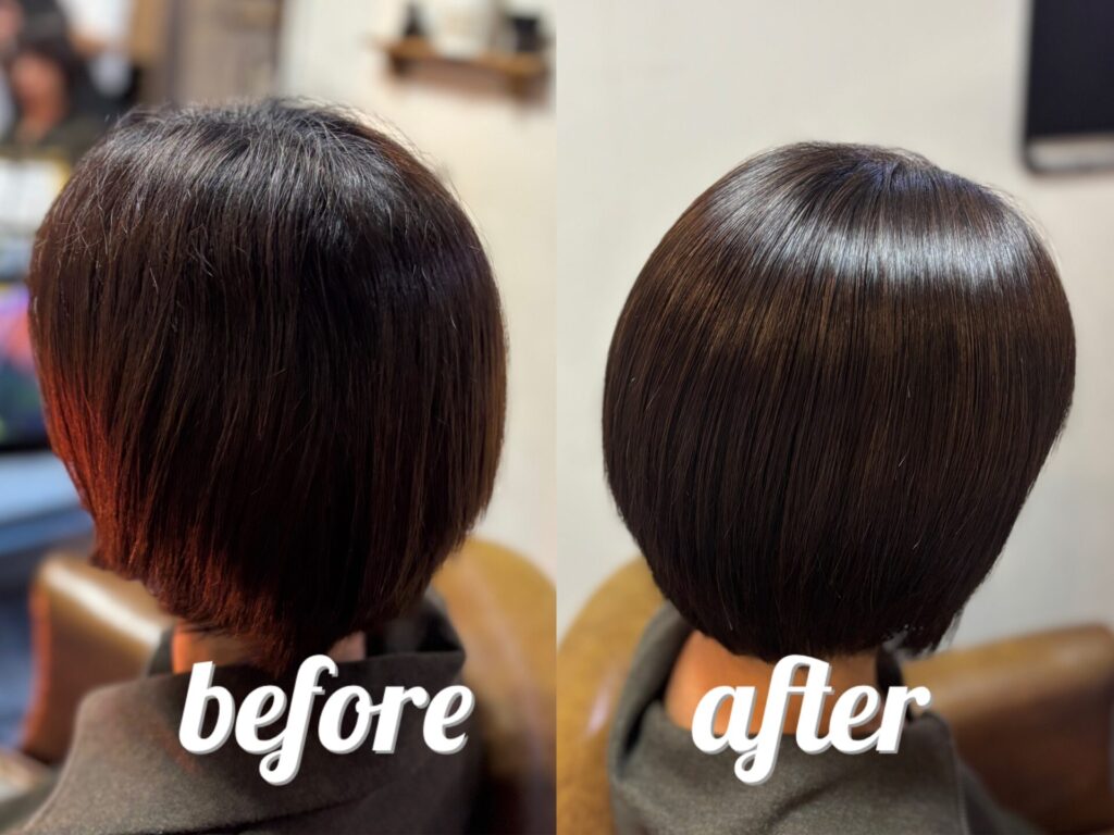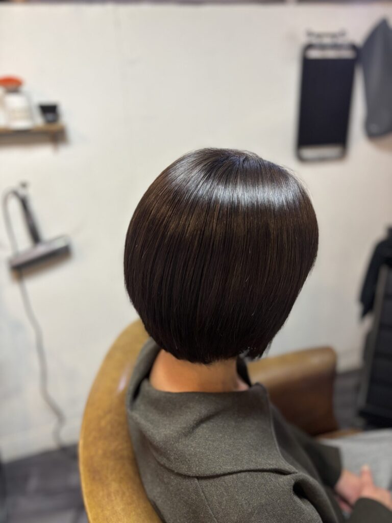 縮毛矯正はピンピンな針金のようになるイメージをお持ちの方もいると思いますが、薬剤選定、処理剤、アイロンワーク等で柔らかく自然な質感で、なおかつ艶髪になるよう心掛けて施術しております。