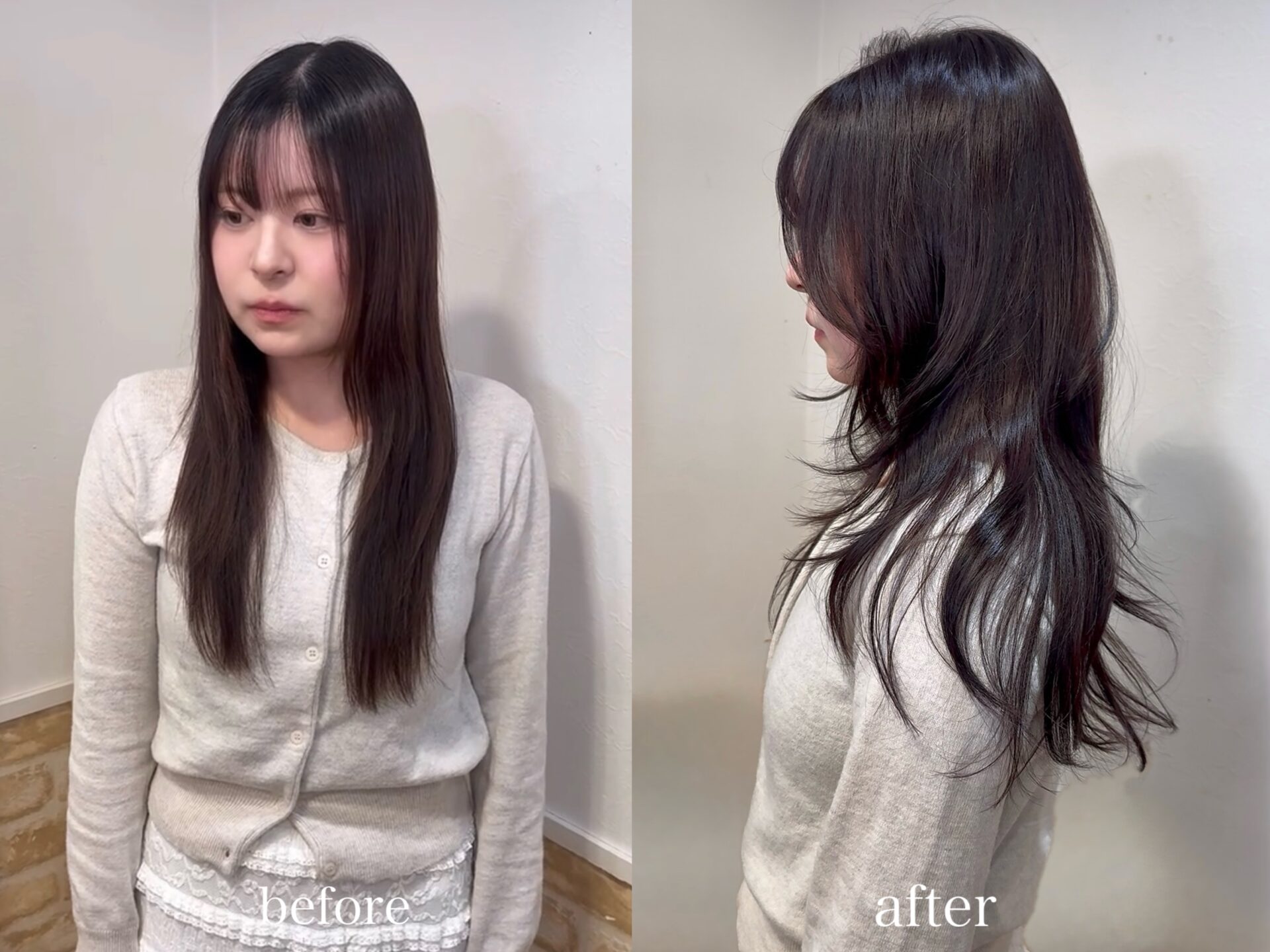 今回は長さは変えずに伸びて重くなったレイヤー部分を中心にカットしてふんわりとした女性らしいスタイルに!
