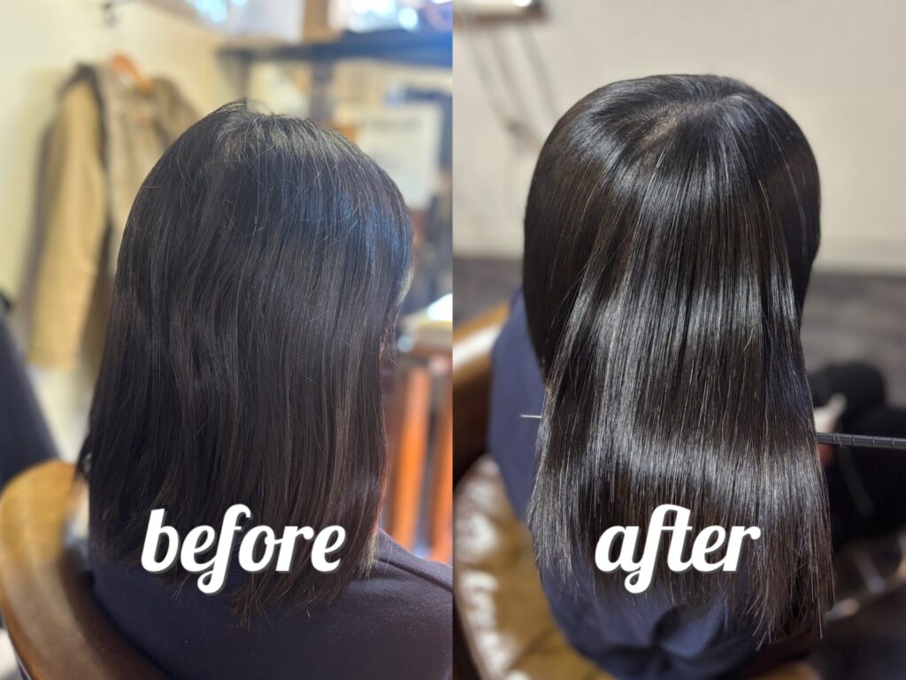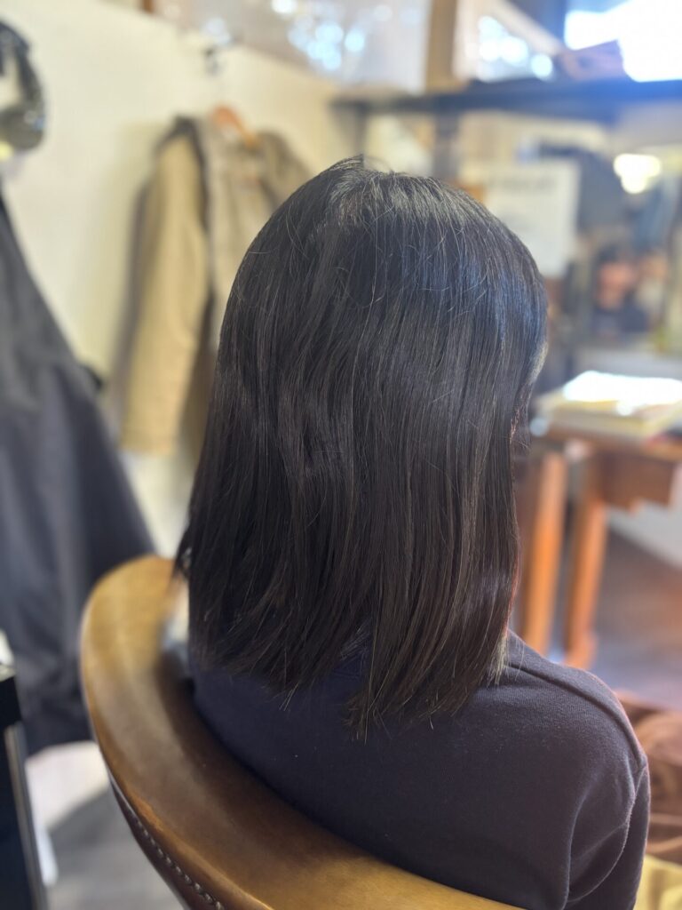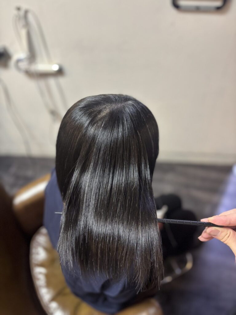 縮毛矯正はピンピンな針金のようになるイメージをお持ちの方もいると思いますが、薬剤選定、処理剤、アイロンワーク等で柔らかく自然な質感で、なおかつ艶髪になるよう心掛けて施術しております。