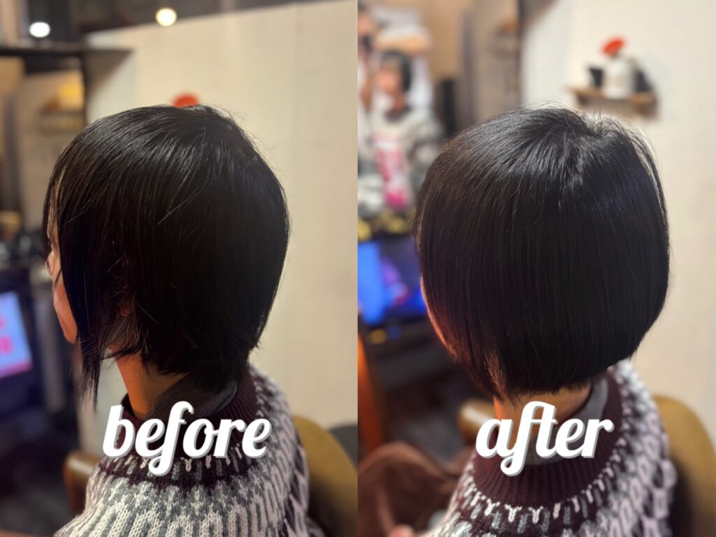 縮毛矯正はピンピンな針金のようになるイメージをお持ちの方もいると思いますが、薬剤選定、処理剤、アイロンワーク等で柔らかく自然な質感で、なおかつ艶髪になるよう心掛けて施術しております。
