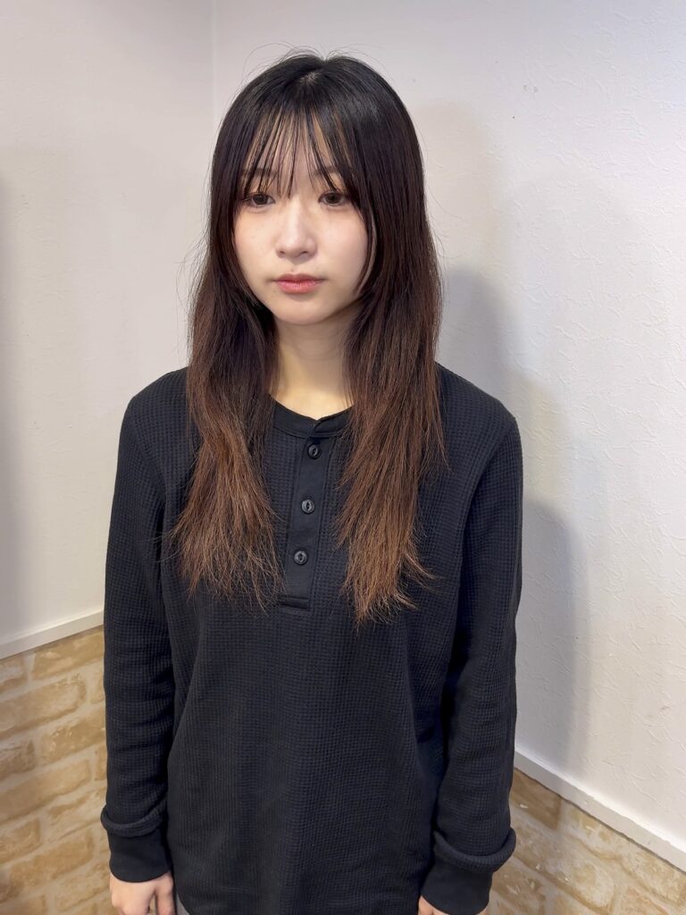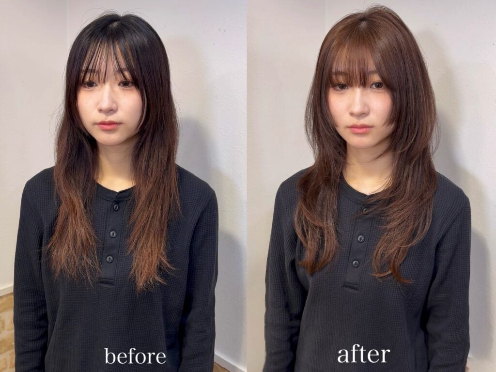 毛先に合わせて極力明るく、全体が同じになるようにカラー配合しています!カラーは伸びすぎると前回のカラーと綺麗に繋がらない場合があるので2ヶ月以内にメンテナンスするのがおすすめです!