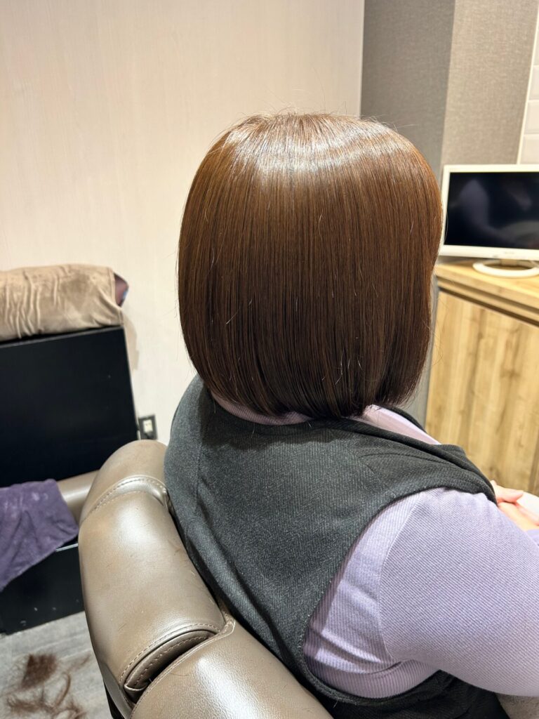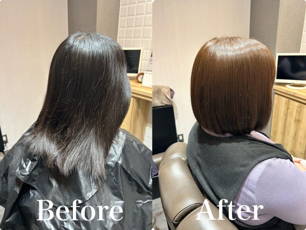 今回のお客様は、伸びたので顎ラインのボブくらいにしたい。ずっと黒髪だったのでワンメイクで出来る1番明るいカラーにしたいとのご相談でした。