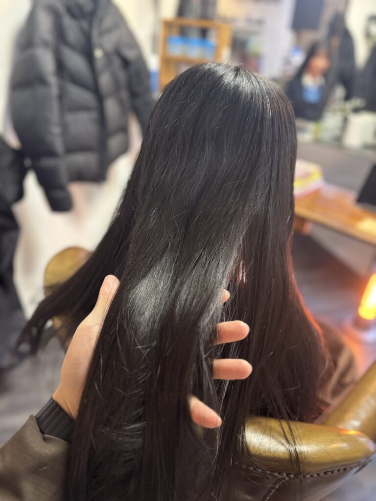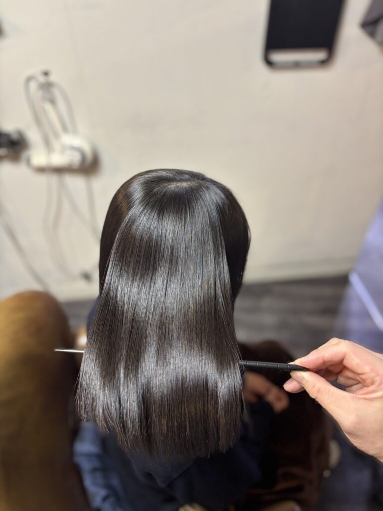 縮毛矯正はピンピンな針金のようになるイメージをお持ちの方もいると思いますが、薬剤選定、処理剤、アイロンワーク等で柔らかく自然な質感で、なおかつ艶髪になるよう心掛けて施術しております。