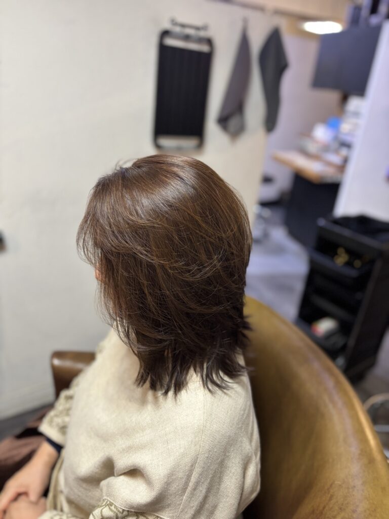 根本の癖、色ともに毛先につながり綺麗なスタイルになりましたね。段も入れてストレートアイロンでも楽にできるスタイルにしました。