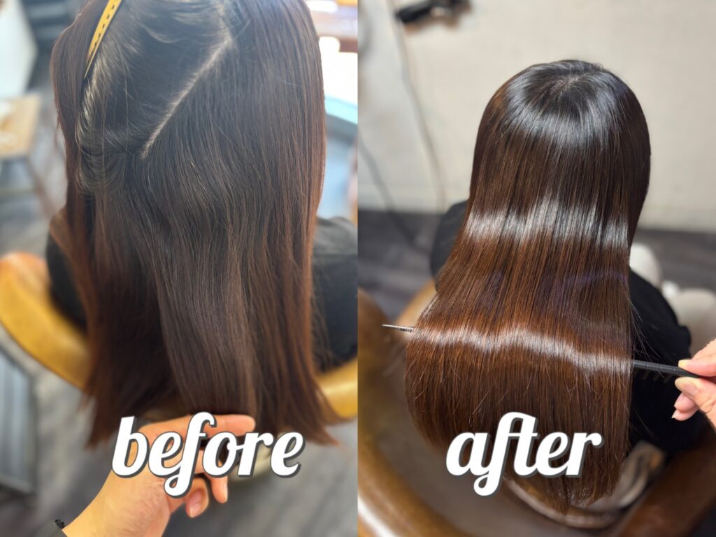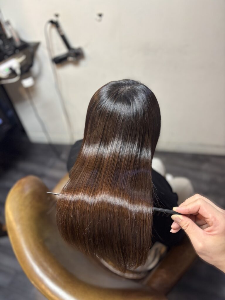 縮毛矯正はピンピンな針金のようになるイメージをお持ちの方もいると思いますが、薬剤選定、処理剤、アイロンワーク等で柔らかく自然な質感で、なおかつ艶髪になるよう心掛けて施術しております。