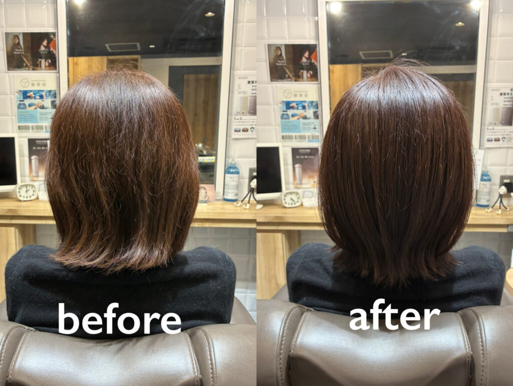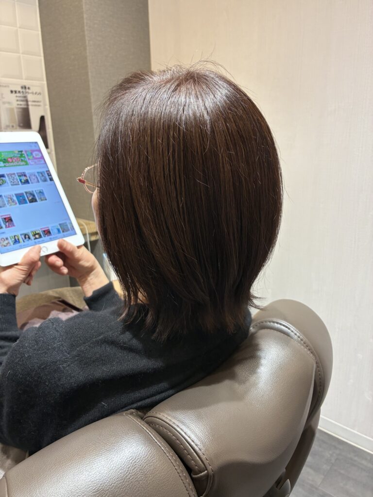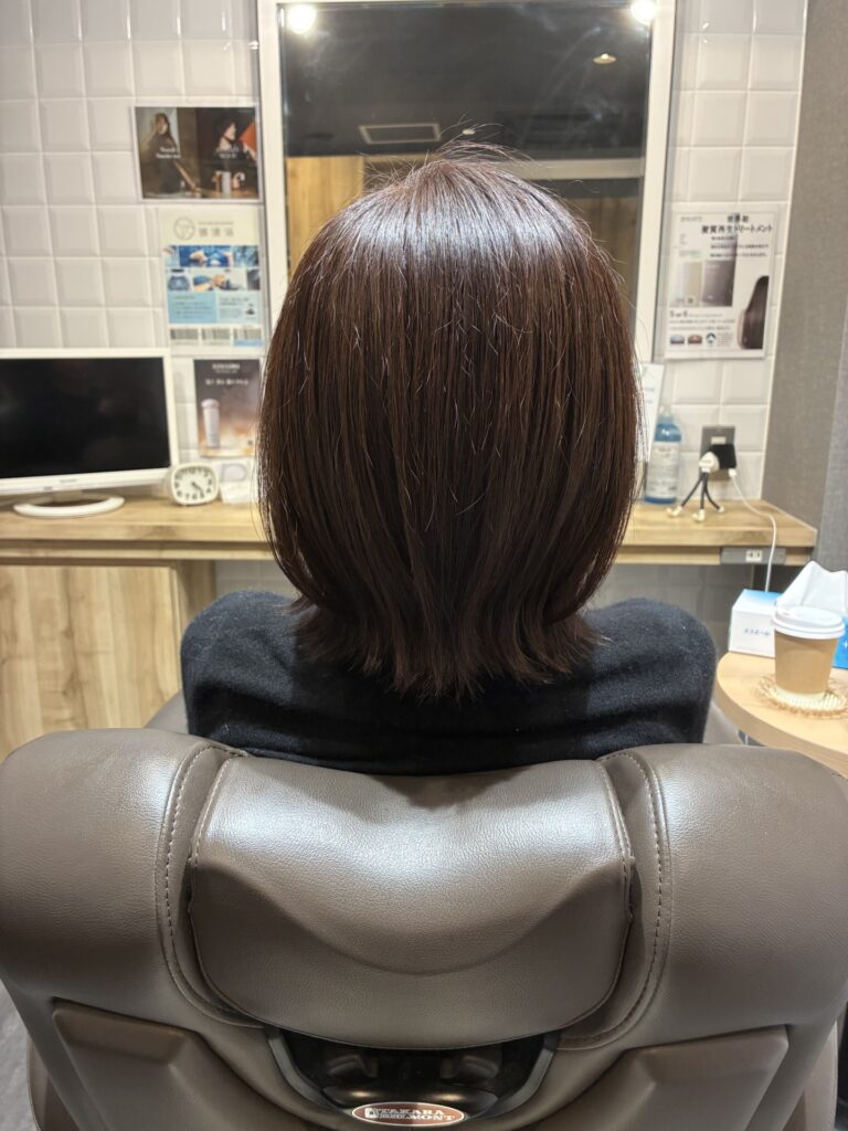 白髪が気になるのと、簡単にスタイリングができればということでしたので【カット、カラー、ヘアエステ】を施術させていただきました。