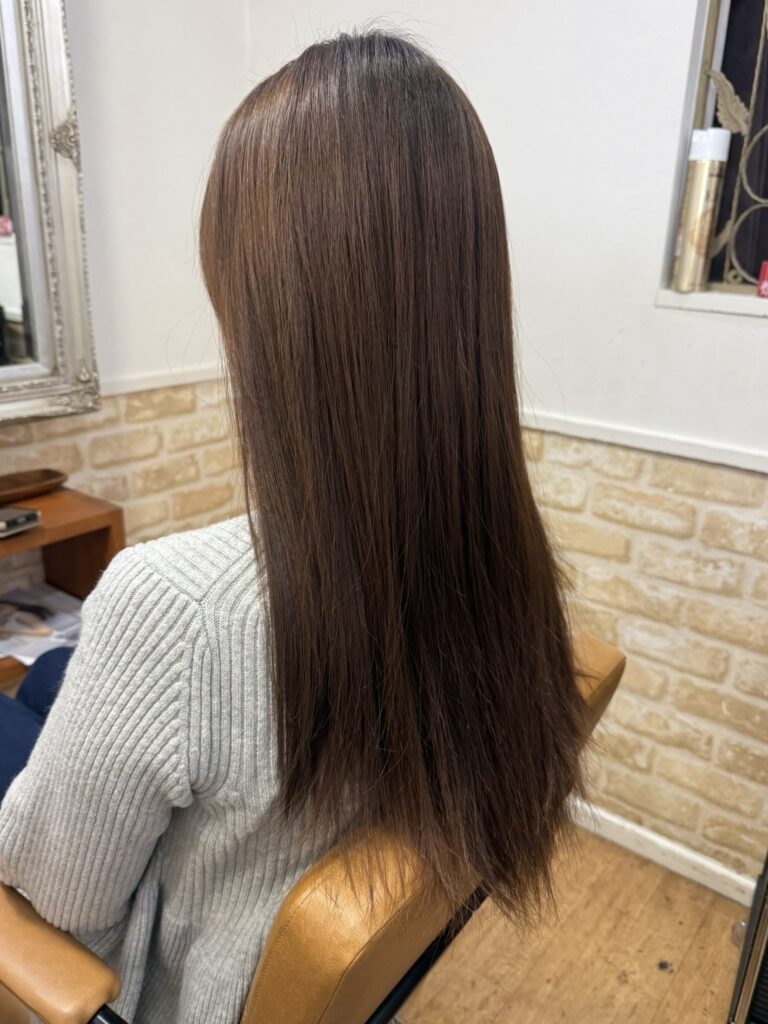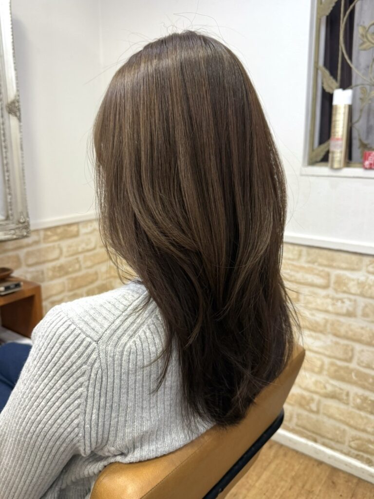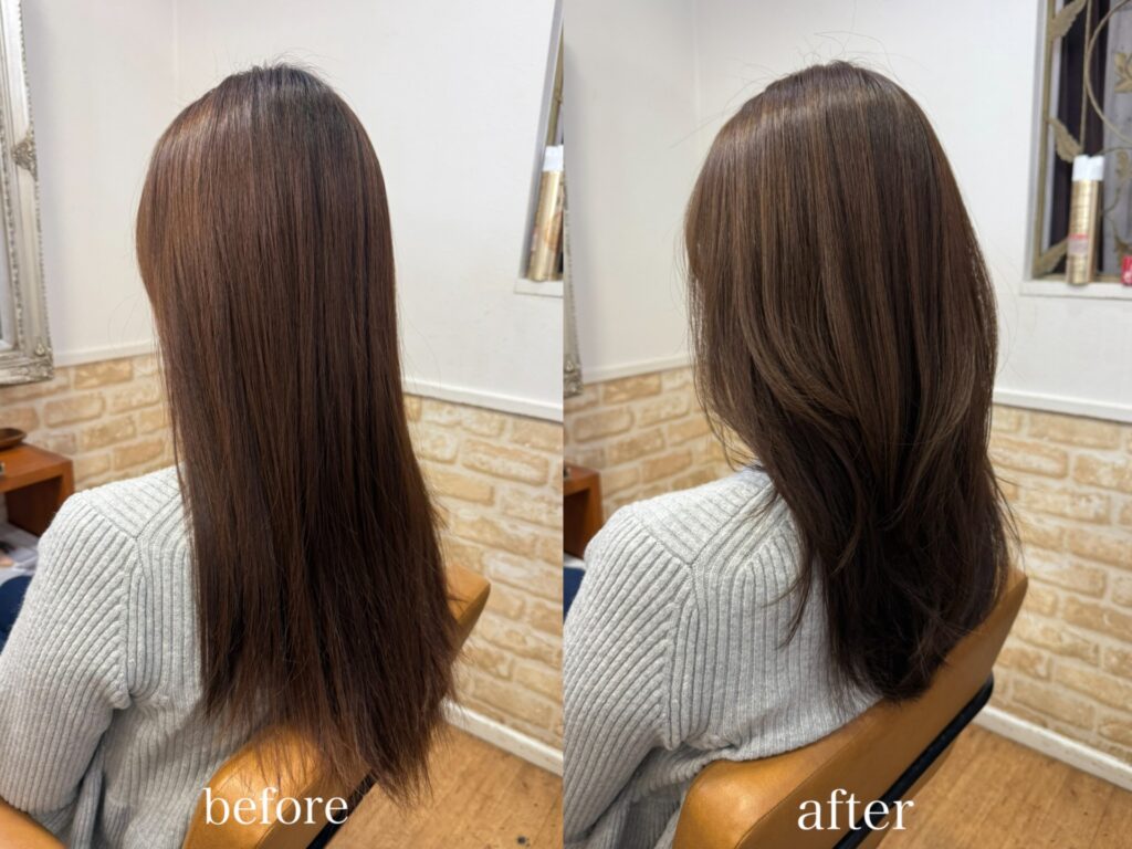 毛先のばらつきがあるところを中心にカットし、レイヤーを入れて後ろ姿もシルエットが綺麗なスタイル♪